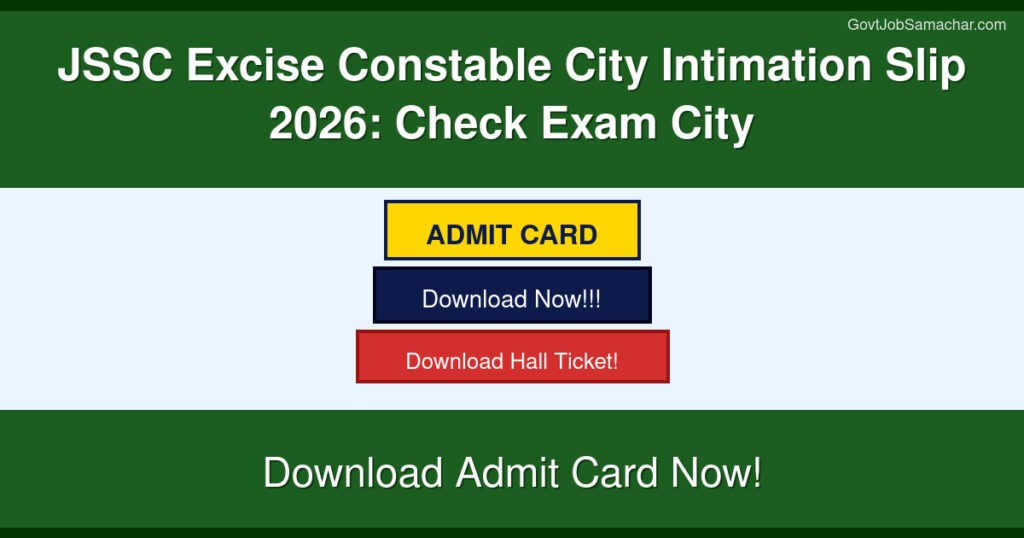 The Jharkhand Staff Selection Commission (JSSC) has officially released the JSSC Excise Constable City Intimation Slip 2026 on 4th April 2026. This slip is specifically for candidates who have qualified the Physical Efficiency Test (PET) for the Jharkhand Excise Constable Competitive Examination (JECCE-2023). The city intimation slip informs candidates about their allotted exam city and district for the upcoming written examination scheduled for 12th April 2026. It is important to note that this is not the admit card – the actual JSSC Excise Constable Admit Card 2026 will be released separately on 9th April 2026.