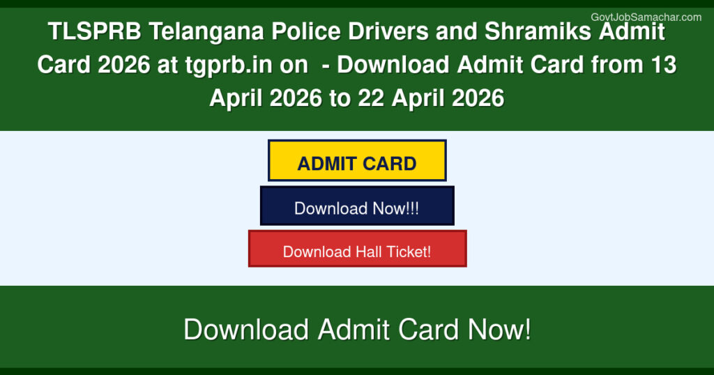The Telangana State Police Recruitment Board (TLSPRB) has announced the release of admit cards for the Drivers and Shramiks recruitment examination scheduled for 2026. This is a significant announcement for candidates who have applied for these positions under the Telangana Police Department. The admit cards will be made available on the official website tgprb.in starting from 13 April 2026 and will remain accessible until 22 April 2026.